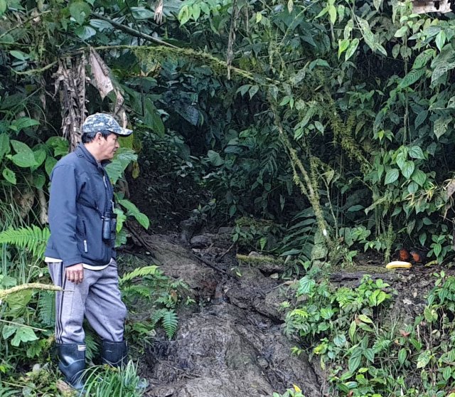 The 4.30 alarm was harsh.. this had better be good. The lodge gave us muffins and bananas to keep us going and we set off with a jolly taxi driver who spoke no English. Our Spanish lessons mean I can manage a little bit of conversation, but only the basics. All the roads here are packed earth, and very twisty and bumpy, so it was an interesting 45 minutes. We pulled up behind a few other vans, just as it was getting light. We were introduced to Angel, one of 2 brothers who own the land at La Paz des Aves. We were in serious company. Mostly men carrying expensive cameras with huge lenses, and top of the range binoculars. We had come to see a rare and iconic bird, the Cock of the Rock. Very elusive, if we were lucky, they would gather here for a short while at dawn.