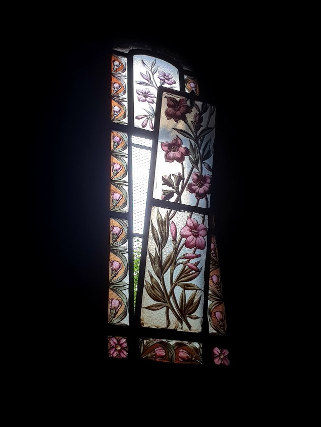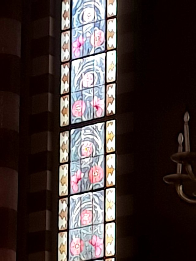 It is unusual because the stained glass windows are all floral, bearing a striking resemblance to William Morris designs!