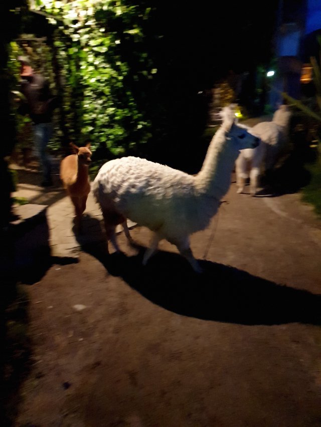 Alpacas and Llamas wandered around freely! This is blurred as it was at night!