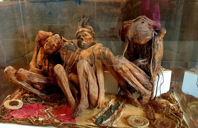 This amazing gold neck plate was retrieved from the only Inca tomb that was not looted, as were these mummified bodies, buried in a foetal position, in reed wrappings, with food and essential possessions, ready for rebirth.