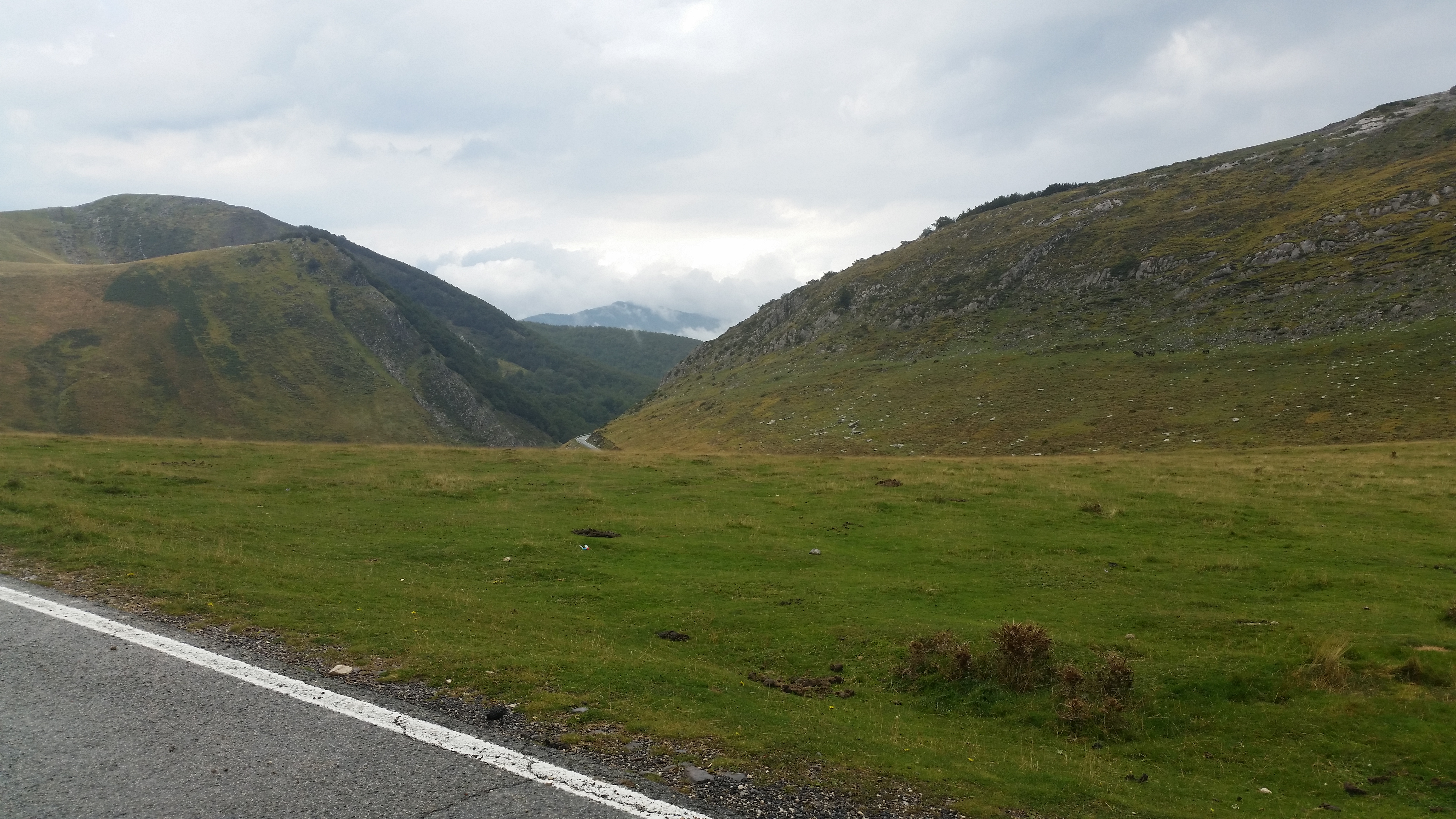 Chris was a hero for braving it! He drove miles and miles through gorgeous valleys and hills, with twists and hairpin bends everywhere! Spain has used it’s EU money wisely, and the roads are really good quality, they just kept getting narrower! Suddenly we were on a remote pass on top of the Pyrénées. The views were awesome, but there were some very menacing clouds in one direction.